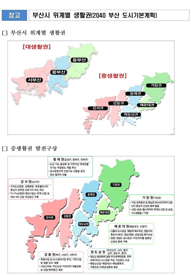 2040 부산도시기본계획상 ▲‘대생활권’은 서·중·동부산권으로 ▲그 아래 ‘중생활권’은 강서·강동·동래·원도심·기장·해운대권으로 나뉜다.