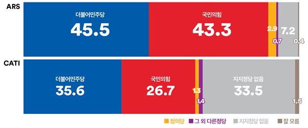 ARS:민주 45.5% vs 국힘 43.3%, 지지정당 없음 7.2%