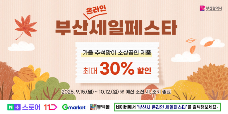 ◈ 시, 할인전을 통해 [지역 소상공인] 판로를 전국으로 확대 [소비자] 우수 제품을 합리적인 가격에 편리하게 구매할 기회를 제공할 것으로 [부산 세계타임즈=이용우 기자] 부산시(시장 박형준)는 오늘(15일)부터 10월 12일까지 약 한 달간 민족 대명절 추석을 맞아 「가을 추석맞이 부산세일페스타(온라인) 특별 할인전」을 진행한다고 밝혔다.