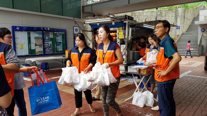 [세계타임즈 이장성 기자] 대전시 소외계층을 위해서 다양한 봉사활동을 실천하고 있는 대전시 SNS 8천명 봉사단체 사단법인 사랑의 사다리 밴드(리더 이정제)는 11일 오후14시,홍도동 행정복지센터(동장 이득범) 주차장에서 추석명절을 앞두고 동구 홍도동 100명 독거어르신들께 가수 박사랑 회원의 후원으로 바비큐 통닭 봉사를 통해서 사회적 효행을 실천 하였다.
