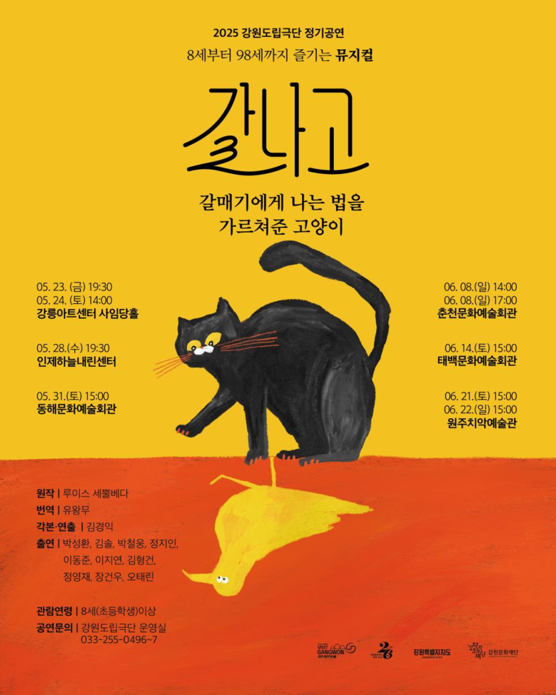 ・8세부터 98세까지 즐기는 뮤지컬로 제작 [강원도 세계타임즈=김민석 기자] 강원문화재단(대표이사 신현상)은 「2025-2026 강원 방문의 해」 기념 뮤지컬 <갈매기에게 나는 법을 가르쳐준 고양이>(이하 갈·나·고) 공연을 오는 5월 23일 강릉아트센터를 시작으로 도내 6개 지역에서 개최한다고 밝혔다.