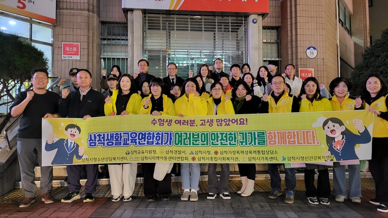 [강원도 세계타임즈=김민석 기자] 삼척교육지원청(교육장 홍명표)은 지난 13일(목), 삼척생활교육연합회(△삼척시청아동청소년과 △삼척경찰서 △삼척시정신건강복지센터△삼척시 가족센터 △삼척시종합사회복지관 △삼척가정폭력성폭력통합상담소 △삼척시청소년상담복지센터 △삼척시지역아동센터연합회) 소속 35명과 함께 수능 후 학생 조기 귀가지도 및 학교 밖 학생생활지도를 위한 합동 순찰을 실시하였다.