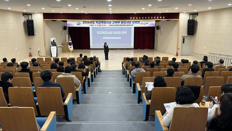 [경남 세계타임즈=최성룡 기자] 경상남도교육청(교육감 박종훈)은 19일(금) 경상남도교육청 진로교육원에서 지방자치단체와 교육지원청, 학교 관계자 100여 명을 대상으로 ‘2026년도 학교복합시설 교육부 공모사업 설명회’를 열었다.