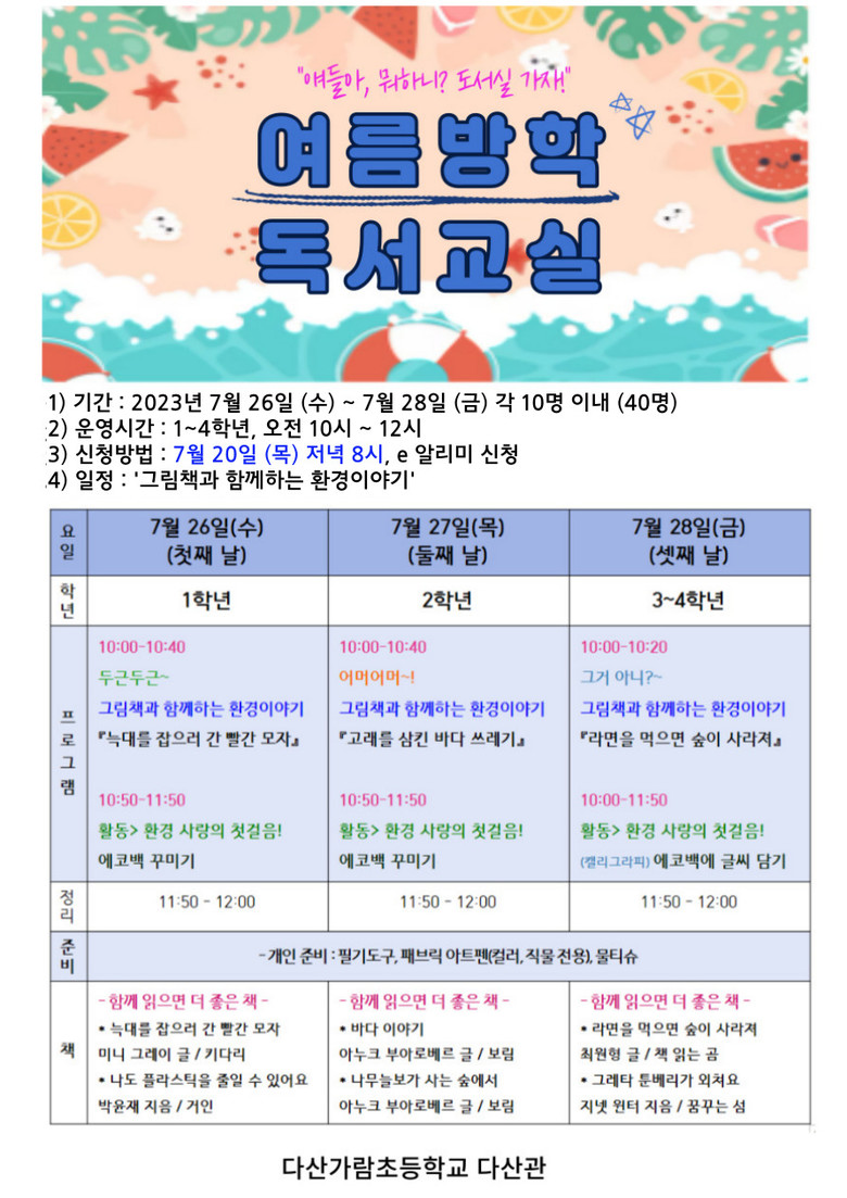 다산가람초 류덕주 교장은 “여름방학을 맞이하여 도서관에서 준비한 프로그램에 참여해 알차고 보람있게 보내길 바라며, 책 읽는 재미에 빠져보는 유익한 시간을 가져보길 바란다”고 말했다.