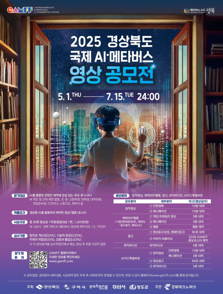 최혁준 경상북도 메타AI과학국장은 “경북은 AI와 가상융합 기술을 활용한 창의적 영상 표현을 적극 장려하고 있으며, 국내외 창작자와 기술자 간의 교류를 활성화하는 장을 만들고자 한다”며 “이번 접수 기한 연장을 통해 많은 우수한 작품이 참여해 주길 기대한다”고 밝혔다.