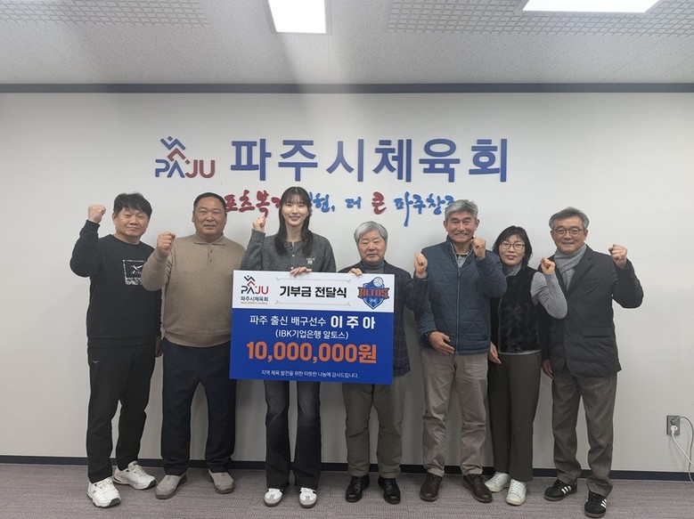 김종훈 파주시체육회장은 “파주 출신 국가대표 선수로 훌륭하게 성장한 이주아 선수가 고향을 잊지 않고 나눔을 실천해 준 데 대해 깊이 감사드린다”라며 “소중한 기부금이 지역 체육 발전과 꿈나무 육성에 값지게 쓰일 수 있도록 최선을 다하겠다”라고 밝혔다.