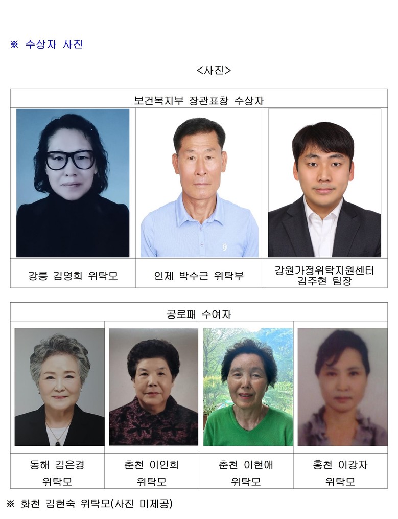 김은경 위탁모(동해)는 21년간 아동을 위탁, 이인희 위탁모(춘천)는 20년간 아동을 위탁, 김현숙 위탁모(화천)는 10년간 아동을 위탁, 이현애 위탁모(춘천)는 13년간 아동을 위탁, 이강자 위탁모(홍천)는 19년간 아동을 위탁하였으며, 위탁아동 모두 건강하게 성장하여 자립하거나 원가정 복귀로 위탁 종결되었다. 위 5인 위탁모는 10년 이상 위탁아동의 건강한 성장과 자립을 위하여 헌신하였다.