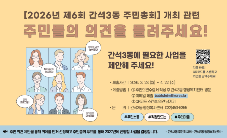 양영수 간석3동 주민자치회장은 “주민총회는 주민이 직접 마을의 문제를 찾고 해결방안을 결정하는 중요한 과정”이라며 “QR코드 참여 등 다양한 방식이 마련된 만큼 작은 의견이라도 적극적으로 제시해 주시길 바란다”고 말했다.