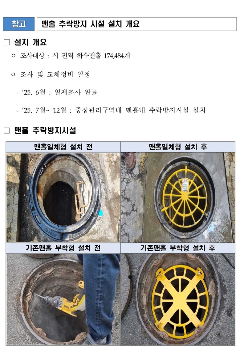 시는 6월 중으로 시 전역에 설치된 17만여 개의 맨홀을 전수 조사하고, 올해 하반기 중으로 중점관리구역(침수우려지역) 내 맨홀 추락방지시설을 전량(약 1만4천 개) 설치할 계획이다.