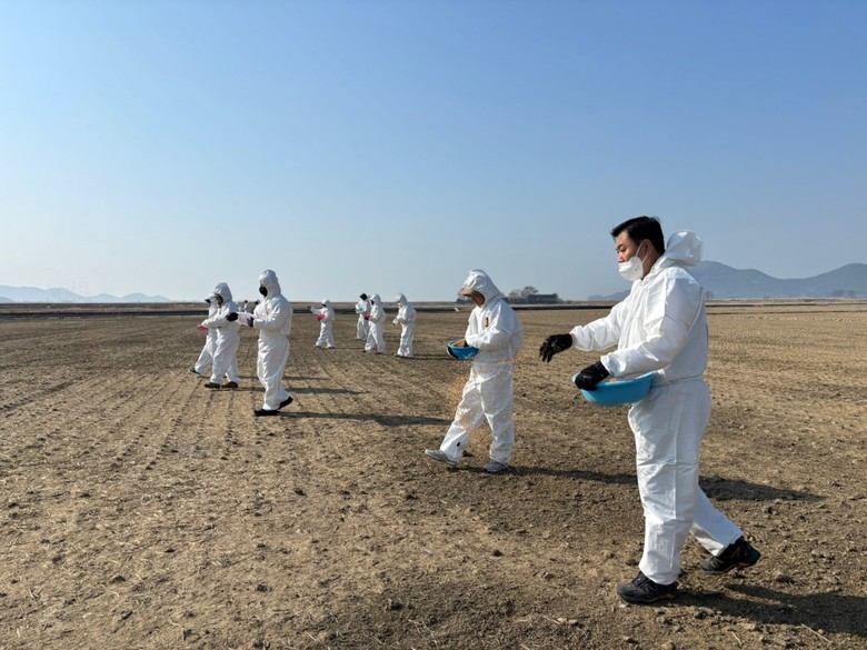 순천만보전과 직원들과 흑두루미 영농단은 이른 아침부터 흑두루미와 다양한 겨울철새들이 머무는 농경지에 볍씨를 뿌렸다.