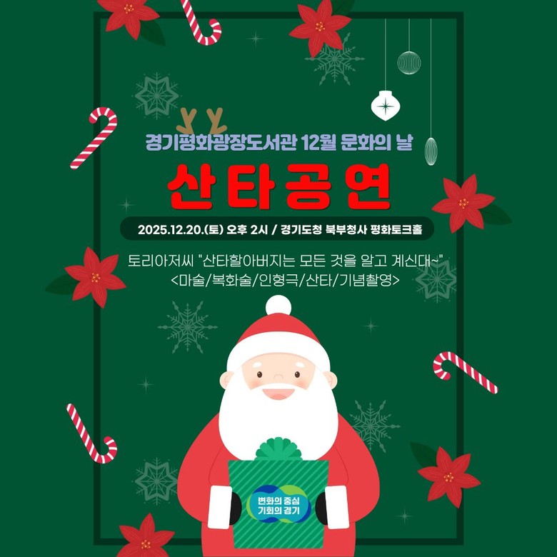 - 문학, 공연예술, 가족 소통이 어우러진 연말 복합 문화 체험의 장 펼쳐 [경기북부 세계타임즈=송민수 기자] 경기도는 12월 19일과 20일 이틀간 도 북부청사 평화토크홀에서 ‘모두가 함께하는 겨울 감성 공연-함께 읽고, 함께 웃는 하루’를 주제로 경기평화광장도서관 12월 문화의 날 행사를 연다.