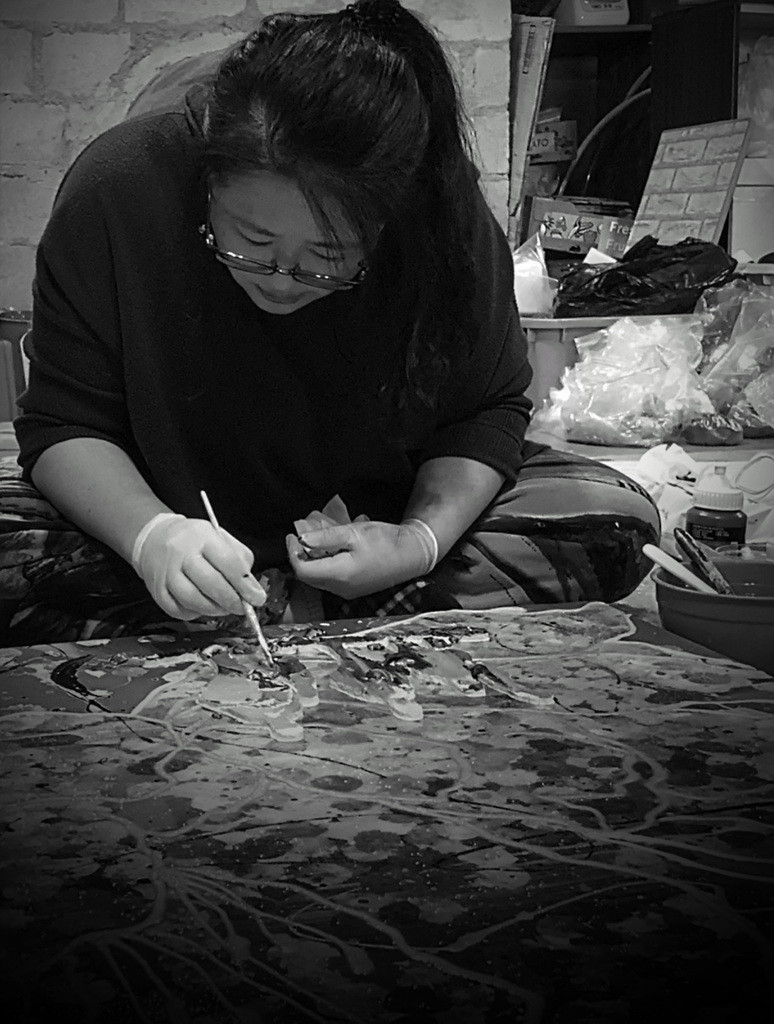 간혹 오롯이 나 자신만을 생각할 때가 있다. 탄생과 삶의 과정에서 살아있음을 확인하고 싶을 때 또는 삶 자체도 비우고 싶을 때 나는 온전히 그림에 던져진 나를 발견한다. 선은 삶의 궤적이고 색채는 무한의 공간에 사유하는 즐거움이다. 선은 공간을 경계 지어 형상을 만들고 나는 손이 가는 대로 몸이 움직이는 대로 따라가다 보면 항상 꽃의 형상으로 드러남을 발견한다. 이 형상은 나의 몸과 이미 하나 된 내적인 모습으로 존재한다. 형상과 우주의 색채가 서로 만나고 동일화되면서 그 위에 영원을 꿈꾸는 행복이 자리 잡는다.