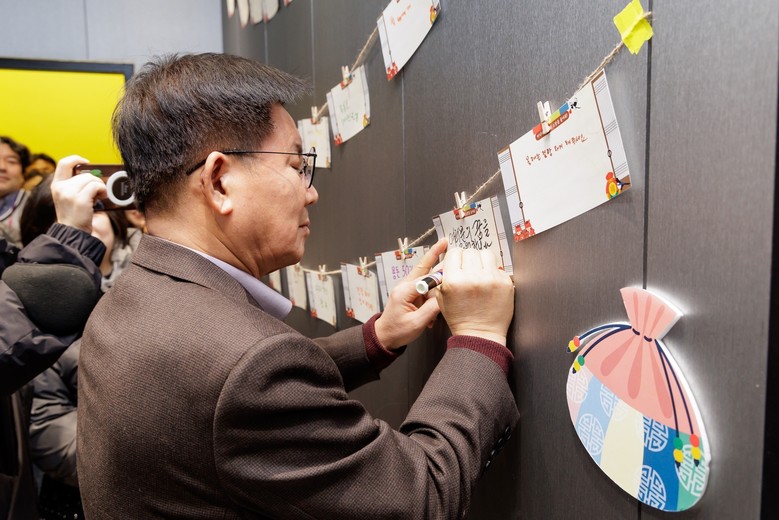 | ▲ ‘도화 뭐하니?’ 축제에서 청소년들에게 전할 덕담을 적고 있는 박강수 마포구청장 |