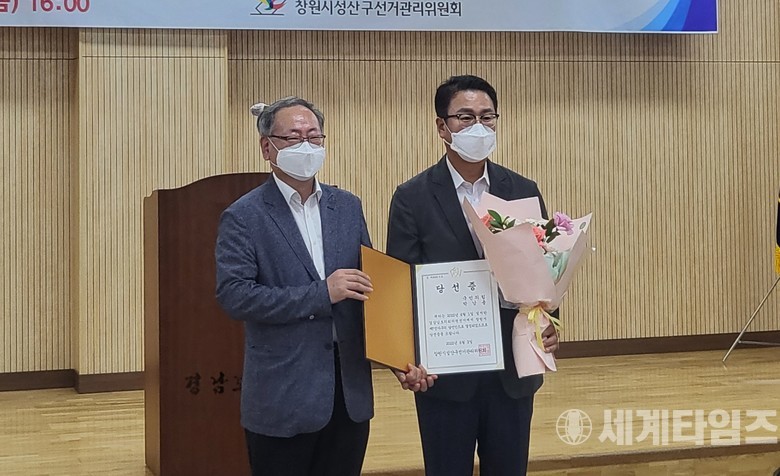 [세계타임즈 = 이진화 기자] 제8회 전국동시지방선거에서 당선된 국민의힘 박남용 창원시 제7선거구 경남도의원 당선자가 창원시 성산구 선거관리위원회로 부터 당선증을 받았다.