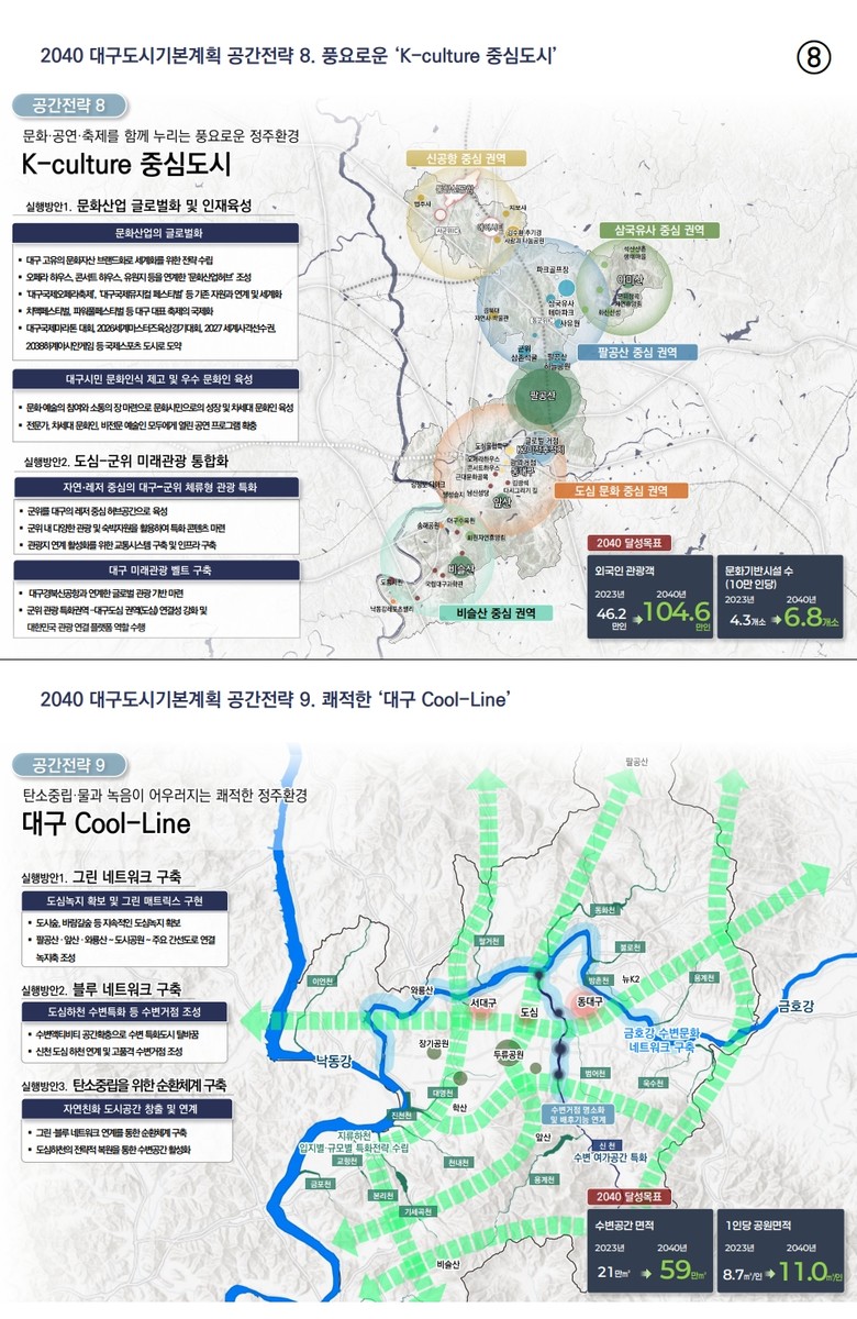셋째, 쾌적한 정주환경 ‘대구 Cool-Line’을 조성하고자 탄소중립 및 물과 녹음이 어우러지는 그린·블루 네트워크를 구축한다.
