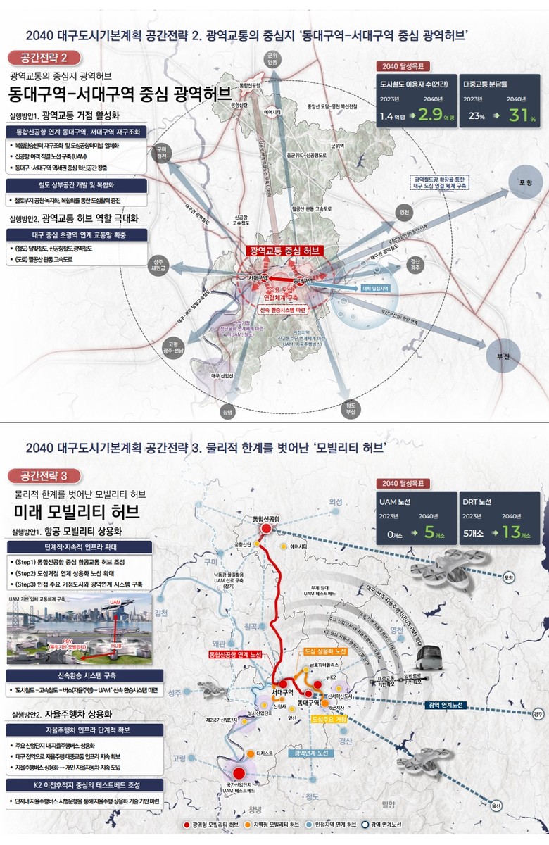 셋째, 물리적 한계를 벗어난 ‘미래 모빌리티 허브’ 조성을 위해 TK신공항, K2후적지 등 주요 거점과 인접지역 및 광역을 UAM, 자율주행 등 신교통과 연결하는 신속 환승시스템을 구축할 계획이다.