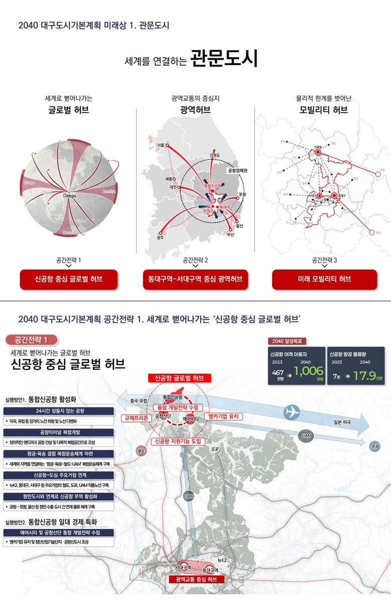 2040년 대구의 미래상은 ‘세계·미래·세대를 잇는 초연결도시 대구’로 제시하고, 미래상을 실현하기 위해 3대 목표를 △세계를 연결하는 관문도시 △미래를 연결하는 활력도시 △세대를 연결하는 매력도시로 설정했다.