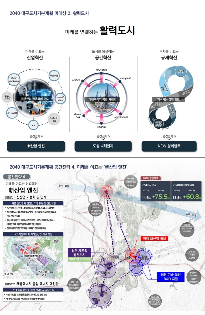 첫째, 미래를 이끄는 ‘新산업 엔진’을 가동하기 위해 K2후적지, 수성 알파시티 등 산업거점 간 연결을 통해 AX 전환 가속화와 재생에너지 대전환을 도모해 5극 3특의 미래 첨단산업 도시로 자리매김한다.