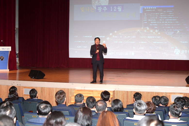 ‘빛나는 광주 12월, 여러분 덕분에!’를 주제로 진행한 이날 정례조회에서 강 시장은 지난 1년 간 시정을 이끌며 느낀 소회를 밝혔으며, 실국별 주요 사업과 수상실적 등 1년 성과를 공유했다. /광주광역시 제공