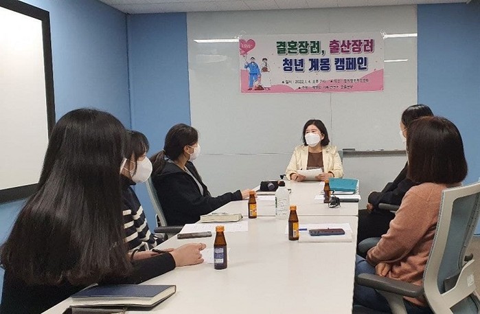 [세계타임즈 백진욱 기자] 행복한가족만들기운동본부 회장 겸 국민의힘 경기도당 저출산대책위원회 위원장인 이서영이 경기창조경제혁신센터에서 3월에 출산을 앞둔 여성과 미혼 회사원 여성들과 함께 '결혼 장려 출산 장려 청년 계몽 캠페인'을 진행했다.