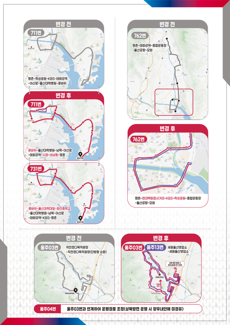 지난 3월 1일에는 동구.북구.울주군 지역의 학생 등교 편의와 주민 불편의 해소를 위해 5개 노선에 대한 조정도 시행한 바 있다.