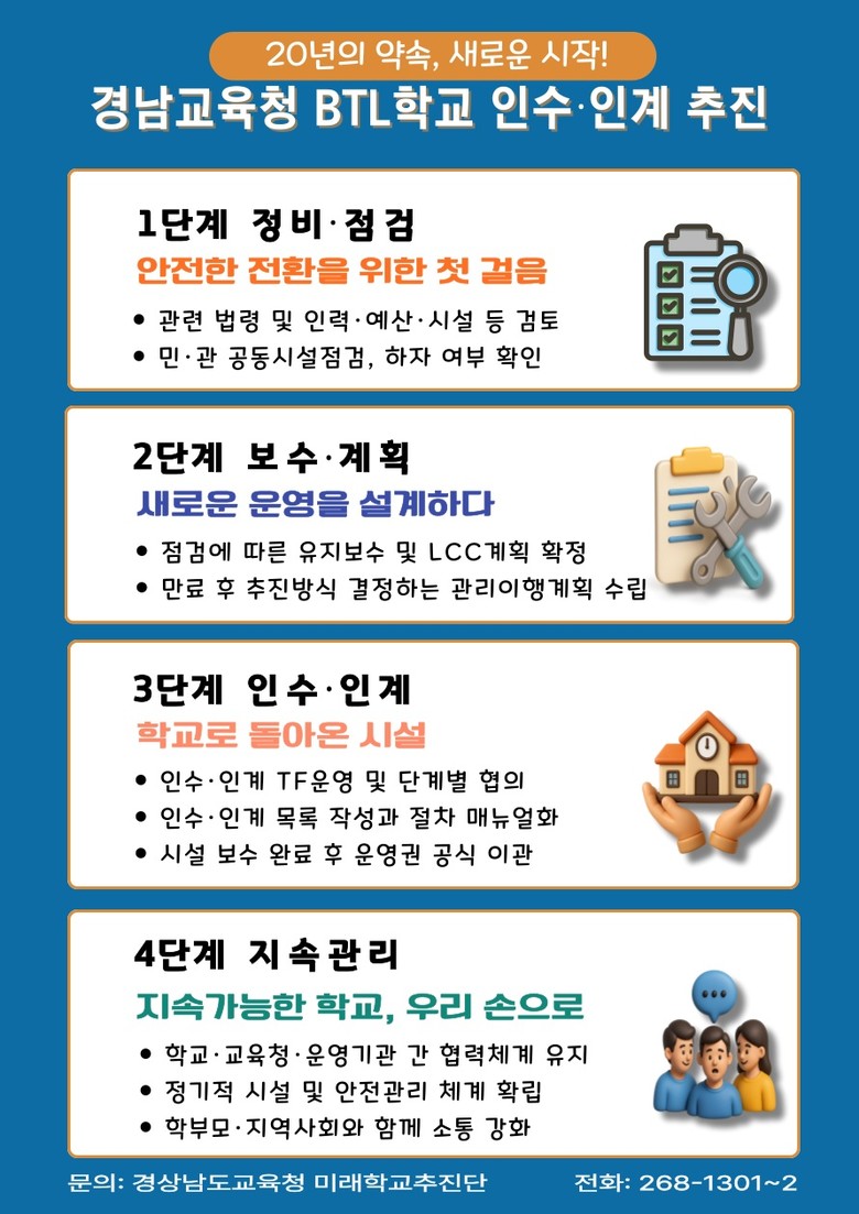도교육청 관계자는 “임대형민자사업 학교 인수인계는 단순한 시설 이전이 아니라, 학생들의 안전한 학습 환경과 직결되는 중요한 절차”라며 “운영 만료 전에 충분한 점검을 거쳐 안정적인 전환을 이루겠다”라고 밝혔다.