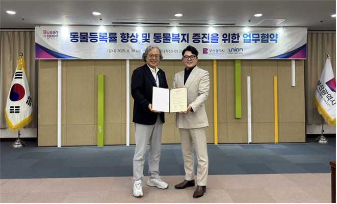 시와 ㈜유니온바이오메트릭스는 이번 협약을 통해 책임 있는 반려동물 양육 문화에 필수 요소인 동물등록제도를 활성화하고, 동물 등록률을 높여 '동물복지 증진'과 '반려동물 친화도시 부산 조성'에 힘을 모으기로 했다.