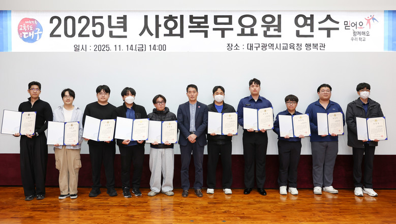 [대구 세계타임즈=한윤석 기자] 대구시교육청은 오는 11월 14일(금) 오후 2시, 시교육청 행복관에서 각급 학교에 배치되어 있는 사회복무요원 320여 명을 대상으로 ‘2025년 사회복무요원 연수’를 실시했다.
