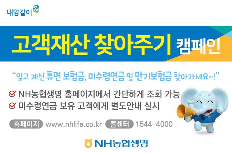 한편, NH농협생명은 휴면보험금 및 미수령 연금·만기·분할보험금 보유 고객에게 △안내장 발송 △전화 안내 △고객 거래 시 안내시스템 활용 △소액 휴면보험금 자동 지급 등 다양한 방법을 통해 잠들어있는 고객재산 찾아주기를 진행하고 있다.