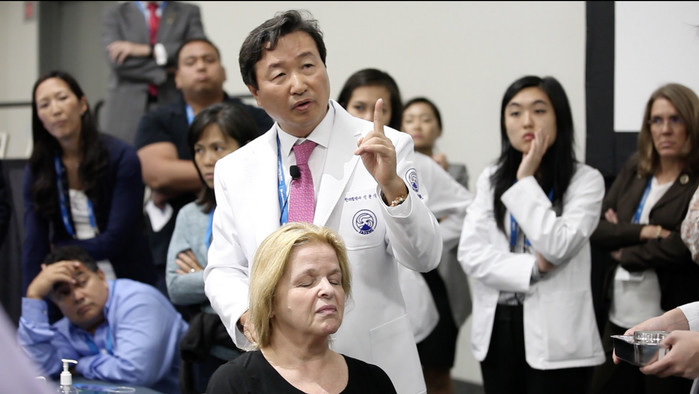 | ▲자생한방병원 설립자 신준식 명예이사장이 지난해 미국 샌디에이고에서 열린 '국제 오스테오페틱의학 콘퍼런스(OMED) 2018'에서 비수술 치료법 강연을 실시하고 있는 모습 |