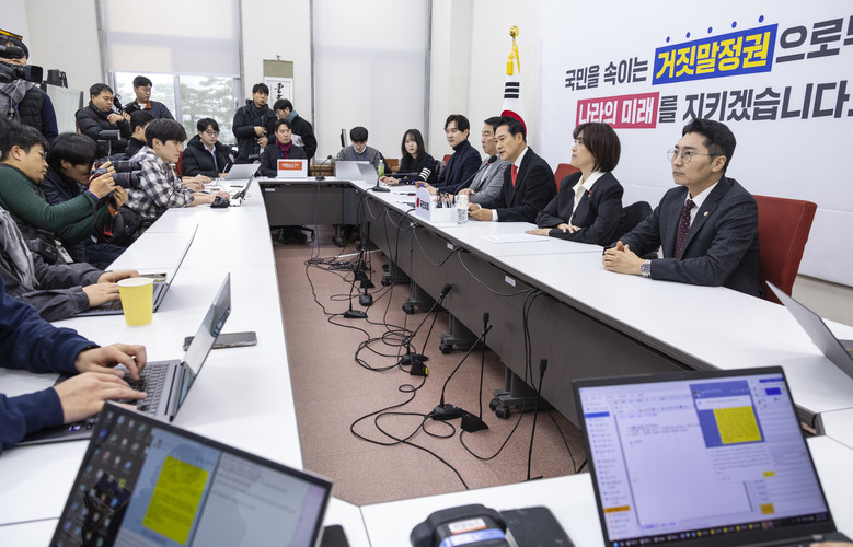 [세계타임즈 = 신상철 기자] 국민의힘 장동혁 대표가 28일 국회에서 열린 기자간담회에서 통일교 특검과 내란전담재판부법, 민주당의 3대 특검 종합 특별검사 추진과 관련한 발언을 하고 있다. 2025.12.28