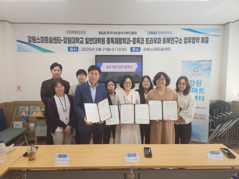 협약식은 강원특별자치도청 내 강원스마트쉼센터에서 개최되었으며, 강원스마트쉼센터 최수진 센터장, 강원대학교 일반대학원 중독재활학과 손원일 교수, 강원대학교 부설 중독과 트라우마연구소 김경옥 교수 등 관계자들이 참석하였다.