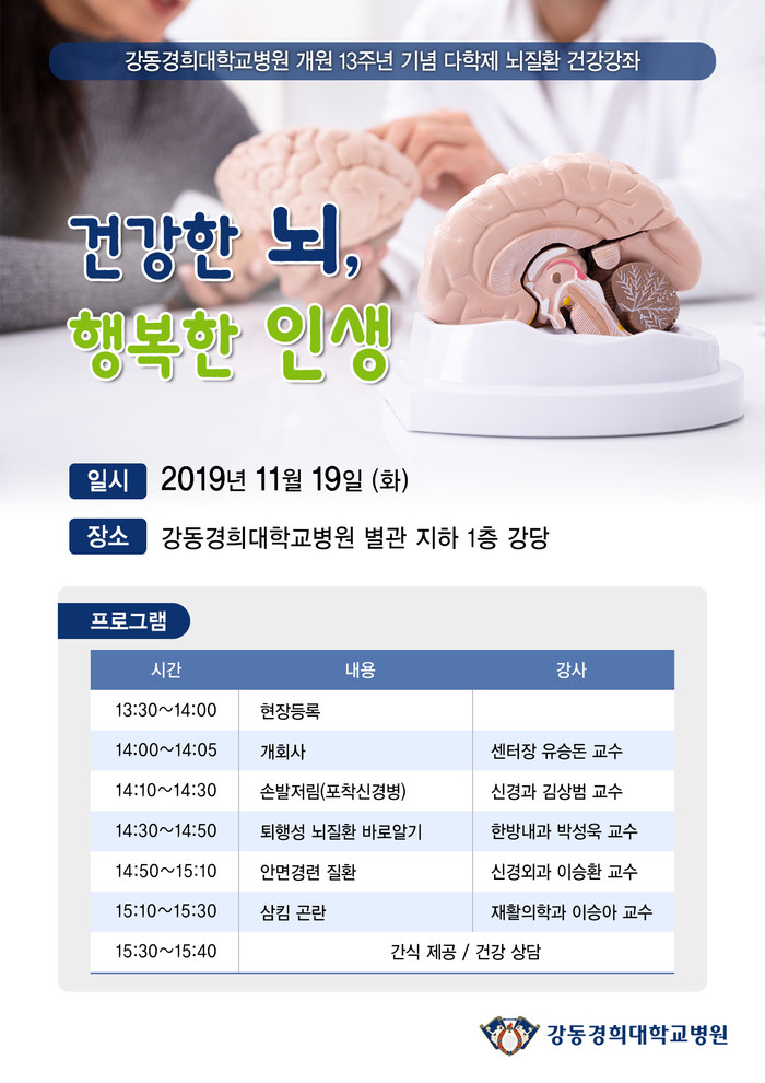 이번 건강강좌에서는 △손발저림:포착신경병(신경과 김상범 교수) △퇴행성 뇌질환 바로알기(한방내과 박성욱 교수) △안면경련 질환(신경외과 이승환 교수) △삼킴곤란(재활의학과 이승아 교수) 등 뇌의 문제로 인한 다양한 질환을 알 수 있는 양·한방 다학제 건강강좌가 준비되어있다. 건강강좌 이후에는 소정의 간식과 함께 뇌 질환에 대한 건강 상담을 진행할 예정이다.
