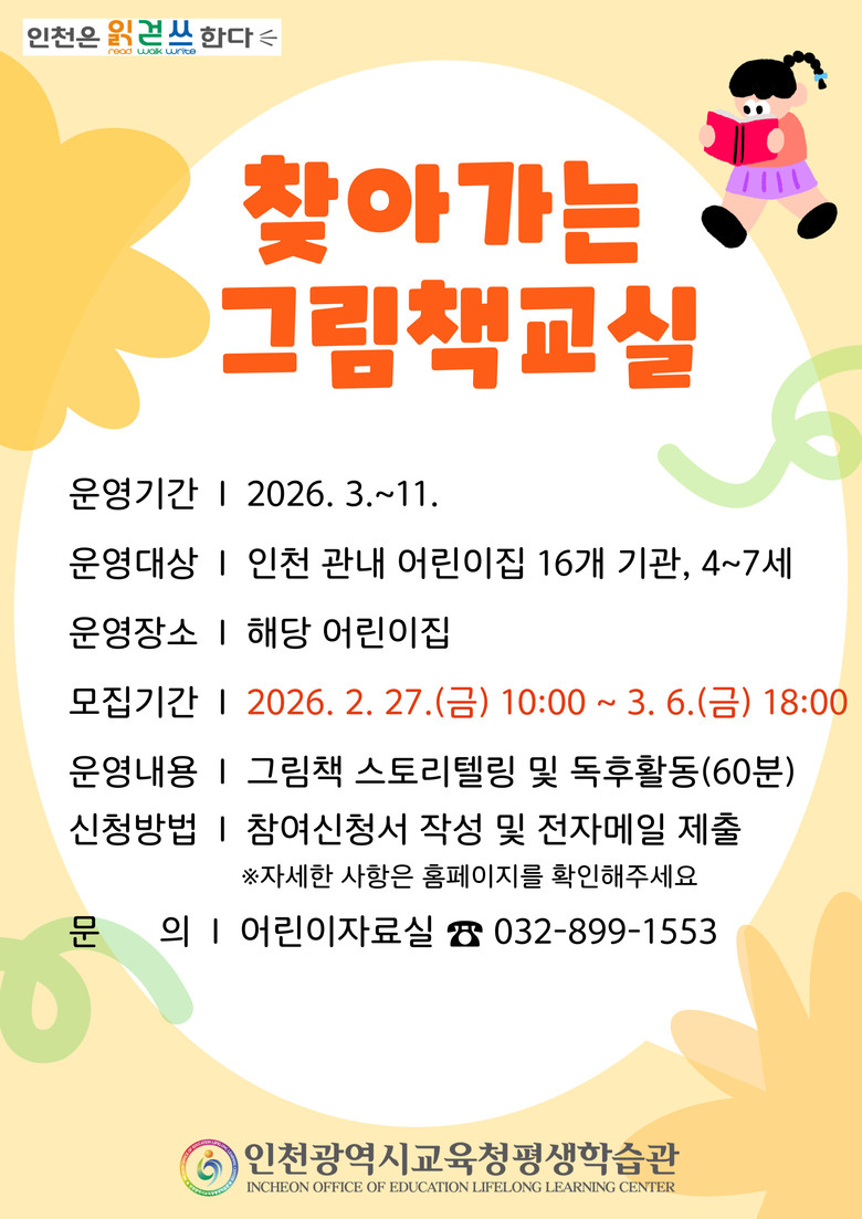 자세한 사항은 평생학습관 누리집을 확인하거나 어린이자료실(☎ 032-899-1552~4)로 문의하면 된다.