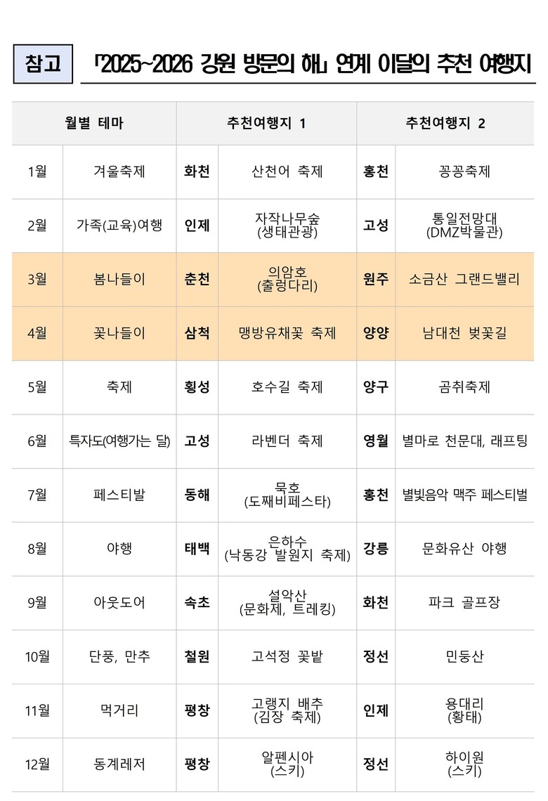 한편, 도와 강원관광재단에서는 사계절 강원 방문을 유도하기 위해 이달의 추천 여행지를 매월 2개소씩 선정하여 홍보하고 있다.
