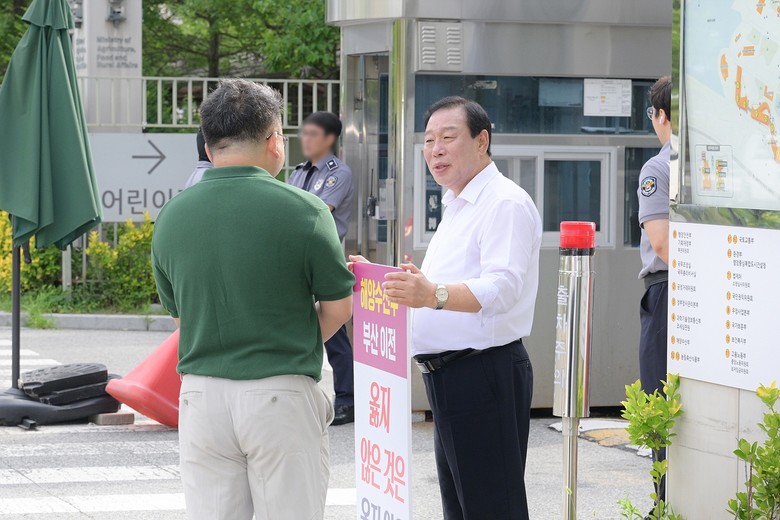 [세계타임즈=세종 이채봉 기자] 2일 정부세종청사 해수부 정문에서 최민호 시장이 해수부 부산 이전 반대 1인 시위를 하고 있다.