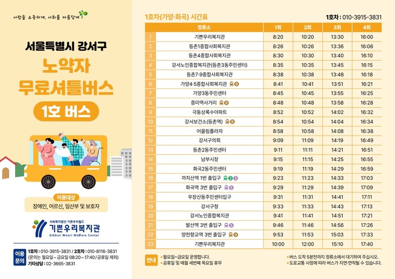 1호차는 기쁜우리복지관을 기점으로 강서노인종합복지관, 증미역, 강서보건소, 어울림플라자, 남부골목시장, 화곡역, 발산역 등 가양·화곡 일대 주요 복지시설과 지하철역을 순회한다.
