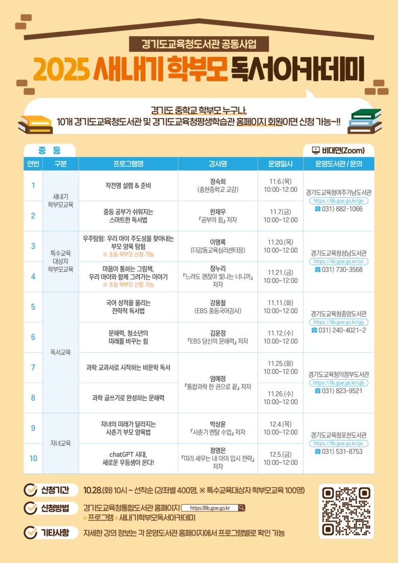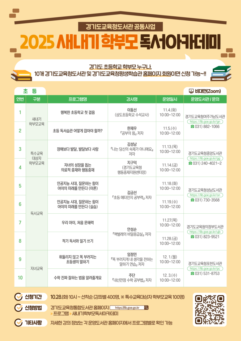 ◦ 28일부터 경기도교육청통합도서관 누리집에서 신청 [경기도 세계타임즈=송민수 기자] 경기도교육청도서관이 경기도 초·중학생 학부모를 대상으로 ‘2025 하반기 새내기 학부모 독서아카데미’를 운영한다.