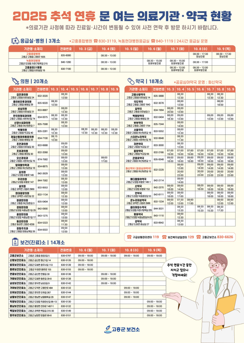[고흥군 세계타임즈=우덕현 기자] 고흥군(군수 공영민)은 다가오는 추석 연휴인 10월 3일부터 9일까지 7일 동안 군민의 응급상황과 의료 이용 불편을 최소화하기 위해 비상진료대책 상황실을 운영하며, 보건기관과 지역 의료기관, 약국과 연계한 비상진료체계를 가동한다고 밝혔다.