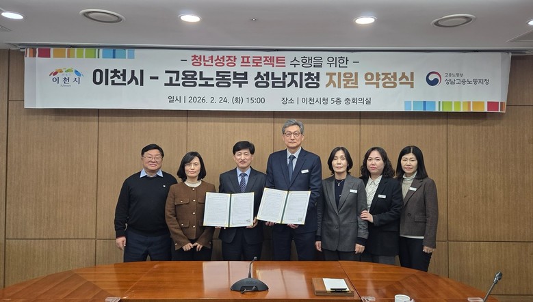 [이천시 세계타임즈=송민수 기자] 이천시(시장 김경희)는 2월 24일 이천시청 5층 중회의실에서 경기지방고용노동청 성남지청과 ‘청년성장프로젝트’ 지원약정을 체결했다고 밝혔다. 이날 약정식에는 이천시와 경기지방고용노동청 성남지청, 한국고용서비스진흥원 관계자들이 참석해 사업의 원활한 추진과 상호 협력을 다짐했다.