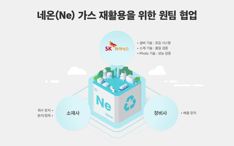 회사는 이 점에 주목해 네온 재활용 기술 개발에 성공했다. SK하이닉스와 TEMC는 노광공정 이후에 스크러버를 통해 공기 중으로 배출되던 네온 가스를 수집 탱크에 포집하고, TEMC의 가스 처리 과정을 통해 네온만 선택적으로 분리해 정제 했다. 이렇게 정제된 네온은 다시 SK하이닉스로 공급돼 반도체 제조 공정에 사용된다. 현재 네온 회수율(배출량*포집량*정제수율)은 72.7%에 이른다. SK하이닉스는 향후 지속적으로 정제수율을 개선해 네온 회수율을 77%까지 높일 계획이다.
