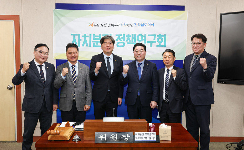 한편, 자치분권 정책연구회는 박원종(영광1) 대표의원을 비롯해 서동욱(순천4), 전경선(목포5), 신민호(순천6), 조옥현(목포2), 박문옥(목포3), 주종섭(여수6), 이재태(나주3), 류기준(화순2), 김주웅(비례)의원 10인으로 구성됐다.