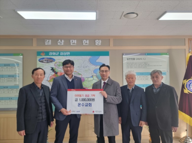 [강화군 세계타임즈=심하린 기자] 강화군 길상면(면장 서광석)이 지난 3일, 온수리 소재 온수교회(목사 조춘성)에서 이웃 돕기 성금 100만 원을 기탁했다고 밝혔다.