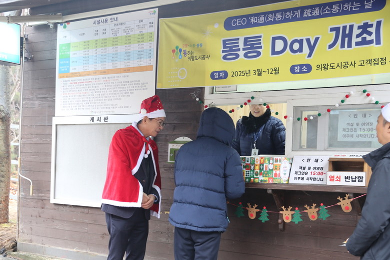 [의왕시 세계타임즈=송민수 기자] 의왕도시공사(사장 노성화)가 12월 23일, 고객 접점 현장의 애로와 고객의 생생한 소리를 직접 경청하기 위한 ‘CEO‘화통(和通)하게 소통(疏通)하는 날, 통통 Day’행사를 의왕 바라산 자연 휴양림 매표소에서 실시했다.