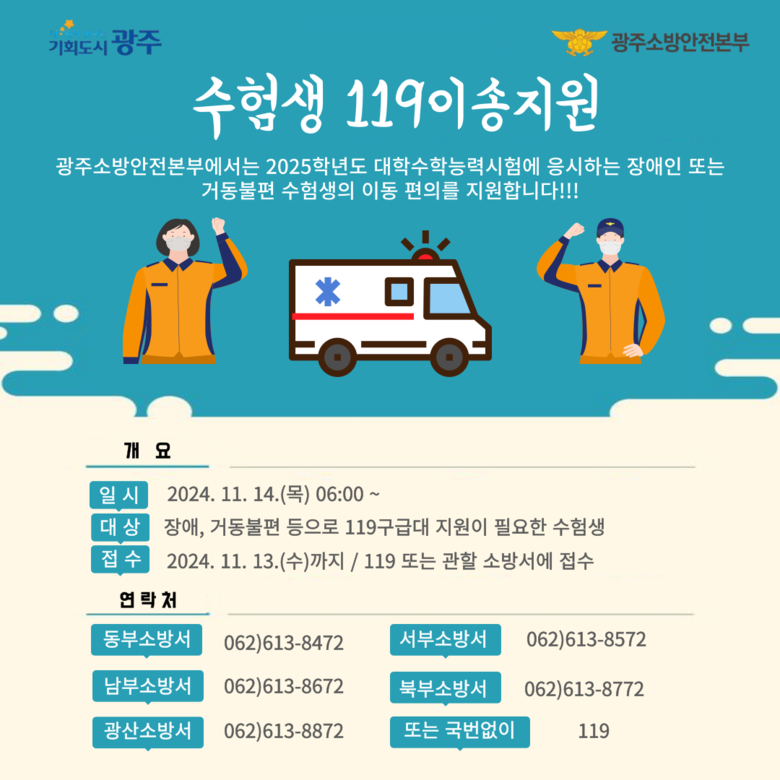 [광주 세계타임즈=손권일 기자] 광주광역시소방안전본부는 오는 11월14일 시행하는 2025학년도 대학수학능력시험에 거동이 불편한 수험생의 편의를 위한 ‘119 이송 서비스’를 제공한다.