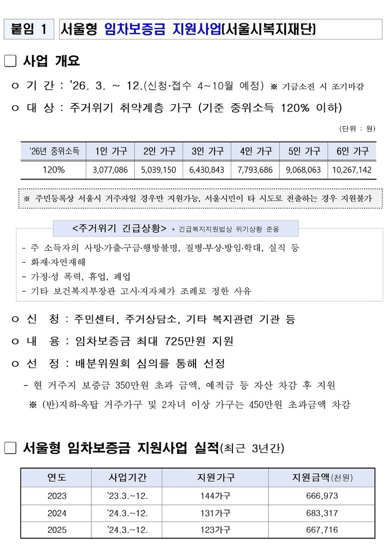 ‘서울형 임차보증금 지원사업’은 주거위기가 발생한 가구에 가구당 최대 725만 원 까지 임차보증금을 지원하는 사업이다.