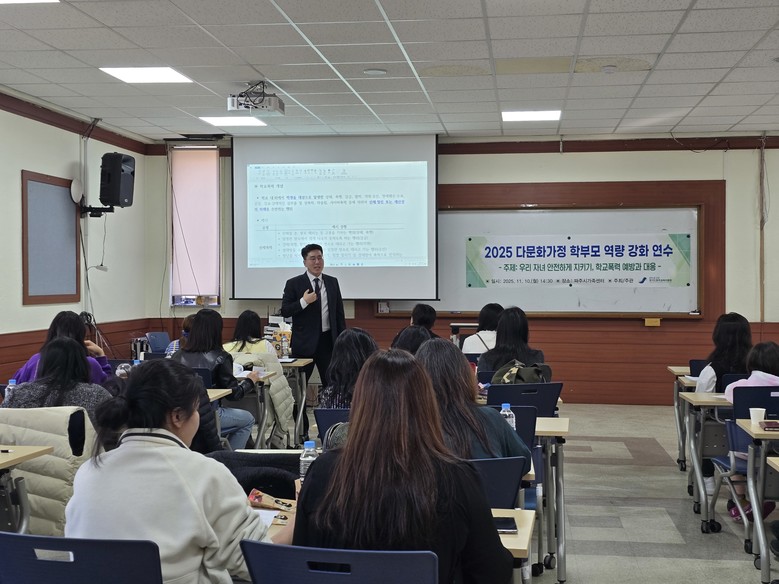 [파주시 세계타임즈=송민수 기자] 경기도파주교육지원청(교육장 전선아)은 11월 10일(월) 파주시 가족센터 강당에서 “우리 자녀 안전하게 지키기: 학교폭력 예방과 현명한 대응”을 주제로 다문화가정 학부모 연수를 실시했다.