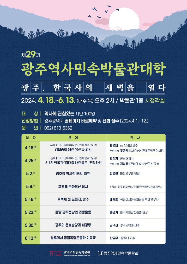 최경화 광주역사민속박물관장은 “이번 박물관대학은 광주역사의 힘과 진정성을 제대로 느낄 수 있는 강좌로 마련했다”며 “시민들이 광주의 시선으로 광주역사를 올곧게 살펴볼 수 있는 계기가 되길 바란다”고 말했다.