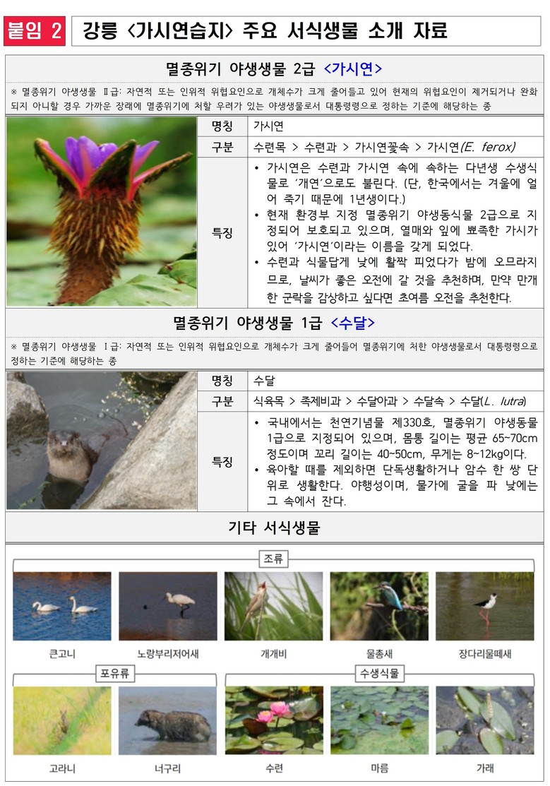 한편, 3월부터는 강릉생태관광협의회를 중심으로 습지 생태계에 대한 전반적인 이해를 돕기 위한 탐방 해설프로그램이 운영되며, 분기별 다양한 체험을 마련할 예정이다.