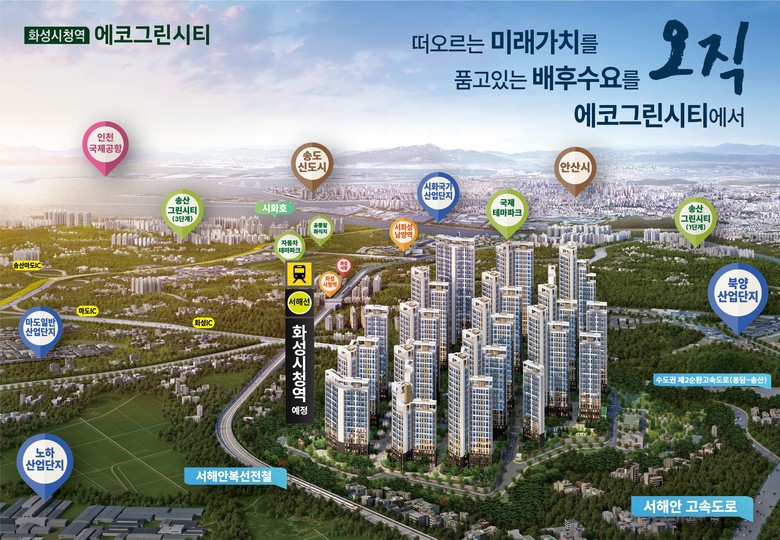 또한 ‘에코그린시티’는 쾌적한 주거환경을 지닌데다 화성시청역(서해선 복선전철)이 2024년 11월 개통을 예정돼 쾌속 교통망으로 기대감을 높이고 다양한 교통망을 갖춰 서울과 경기 도심으로 빠른 이동이 가능해 실수요자로부터 관심을 받고 있으며, 미래 개발 가치도 높이 평가받는다.